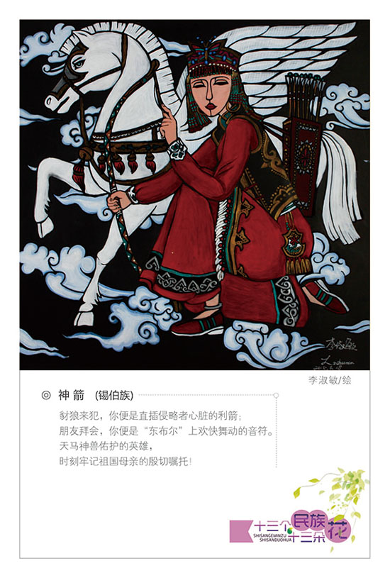 凭借手上有限的资料和深入实际的体验,李淑敏充分发挥艺术想象力,完成了这套系列装饰画作品,力求每一幅画都有明显的差异性,努力表现出各民族的特色。