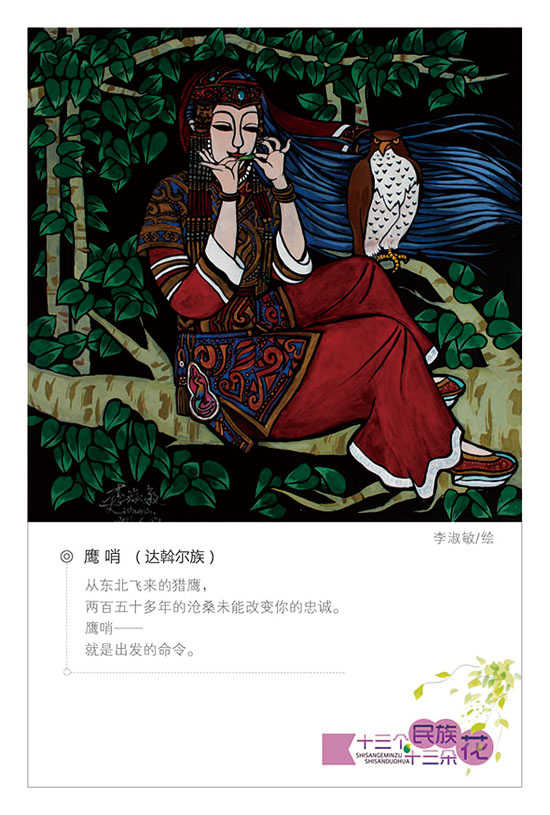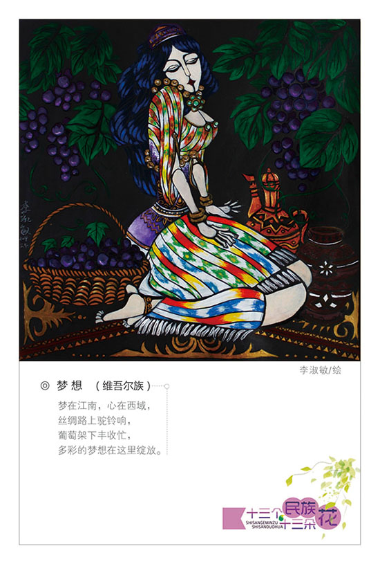 “在历史的沉淀、文化的传承中,新疆逐渐形成了13个世居的民族。勤劳、善良的各族人民在生活上相互帮助、理解,在文化上相互影响、交融。在保留各民族鲜明特色的基础上,兼容并蓄、博采众长、推陈出新。各族人民在新疆这160万平方公里的大地上,书写着传奇,竞相绽放出美丽神奇的风采!”这是新疆维吾尔自治区乌鲁木齐市高级中学美术教师谢鸿为她的学生李淑敏《十三个民族十三朵花》系列装饰画写下的前言。