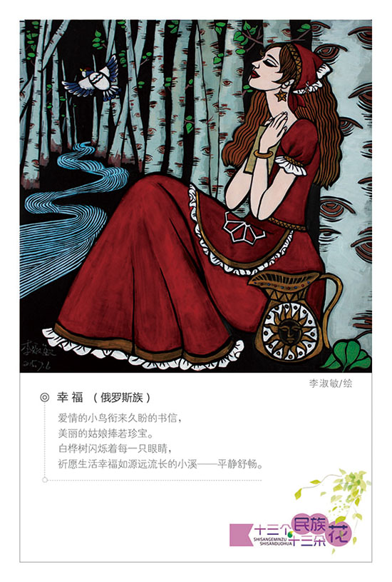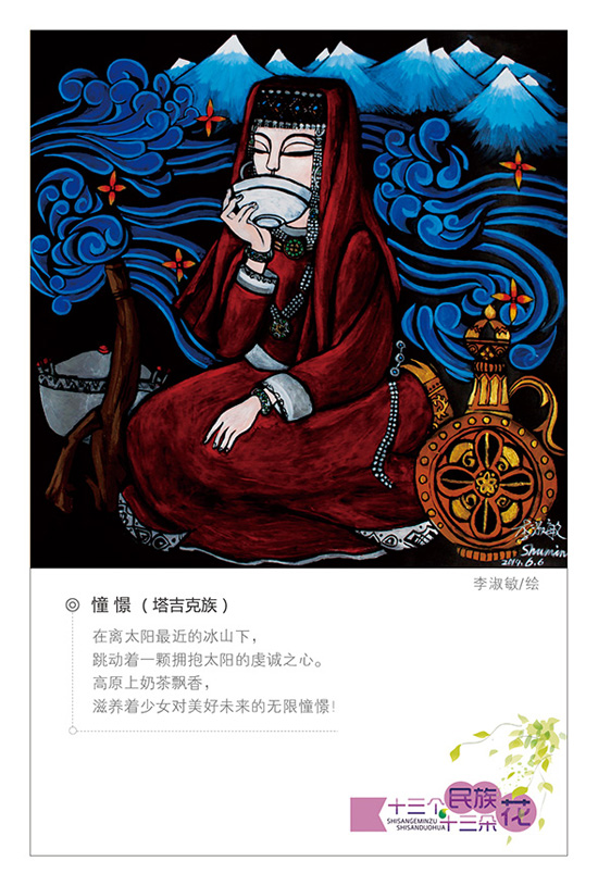 《十三个民族十三朵花》系列装饰画在印制成明信片时配了短诗,诗文的作者是李淑敏43岁的母亲刘玉萍。她在《塔吉克族》这幅画的配诗《憧憬》中写道:“在离太阳最近的冰山下,跳动着一颗拥抱太阳的虔诚之心。高原上奶茶飘香,滋养着少女对美好未来的无限憧憬。”