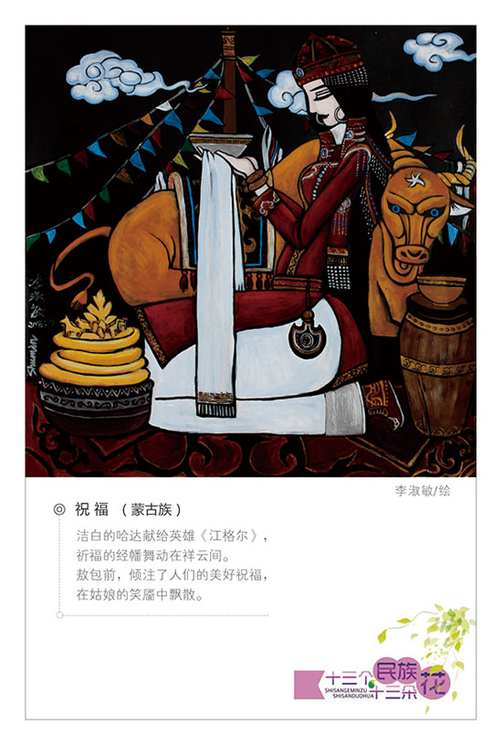凭借手上有限的资料和深入实际的体验,李淑敏充分发挥艺术想象力,完成了这套系列装饰画作品,力求每一幅画都有明显的差异性,努力表现出各民族的特色。