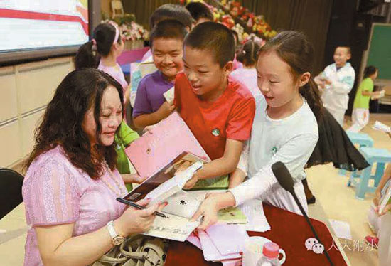 “我们一直倡导少儿阅读。”人大附小校长郑瑞芳说,“人们常说,不爱阅读的民族是一个没有希望的民族;爱阅读的孩子是一个有潜质的孩子。作为教育工作者,我们曾反复与家长探讨,要在阅读中陪伴孩子长大。只要孩子爱读书,不用报那么多课外班,很多知识不是老师在课堂上教的,是从书中学到的。”她谈到,“比如杨红樱的书,传递着正能量,充满了是非观念,做人的道理。”郑校长曾获首届全国“十佳卓越校长”称号,提倡“理想、责任、仁爱、阳光、感恩、养成、创新”七彩德育教育理念,出版过《做一件幸福的事·我的笑长生涯》一书。