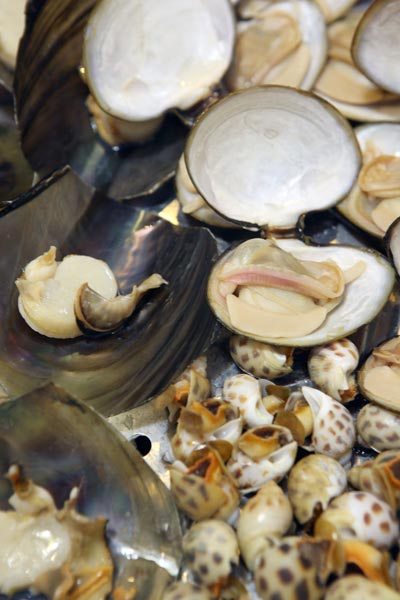 贻贝,这是一路上我最爱吃的海鲜,每顿都可轻松解决大半盘。不约而同,同行的朋友也是如此。当地人常打趣道:“最便宜的,你们一吃一大盆;最珍贵的,反倒不合你们的口味,真是没有口福哇。”贻贝是一种十分常见的贝类,在大连,人们称为它作“海红/虹”,而它的干制品叫做“淡莱”。有趣的是,贻贝因其外观像女性的某一器官,得了“东海夫人”的雅号。