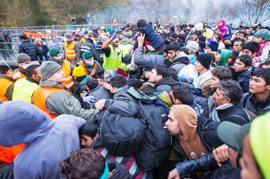 10月29日,在斯洛文尼亚与奥地利边境,难民在等待进入奥地利。由于人员众多,场面混乱不堪,有的难民甚至试图翻越围栏过境。