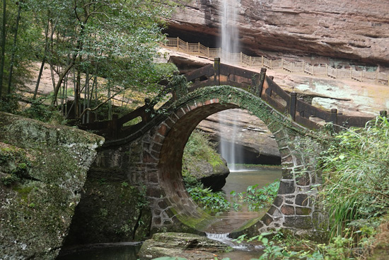 顺着舒服的木头栈道上上下下、曲曲弯弯往里走,才发现山重水复不简单。到了罗汉岩下面,眼睛就睁大了,嘴也张开了。什么感觉呢?好比住平房的人,某一天一觉醒来发现隔壁突然多了一栋200层高、500米宽的实心大楼一样,还像比萨斜塔一样向你倾斜。两条不很大的瀑布从楼顶飘落,三心二意,婷婷袅袅。更奇的是,从大楼底部开始裂开一条缝,缝里头有条路可以让你从一楼斜斜地爬到100楼,最宽的地方小汽车都开得进去。你一边走一边琢磨,这么宽的缝,如果承受不了上面的重量咔嚓一下塌了会怎么样?