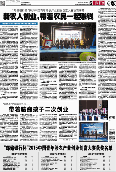 在“邮储银行杯”2015中国青年涉农产业创业创富大赛上,经过激烈角创意组、初创组和成长组的各有10名选手进入决赛。其中,成长组10强项目获得中国邮政储蓄银行1.2亿元现场授信。自7月份启动以来,全国共有31个省(区、市)举办地区赛,4.3万多个项目、5万余名创业青年报名参与。截至目前,共有11250个项目获得32.5亿元银行授信,218个项目获得10.6亿元意向风投。