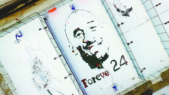 12月6日,吉林市北华大学的学生在操场上用积雪“画”出即将退役的NBA篮球巨星科比肖像。
