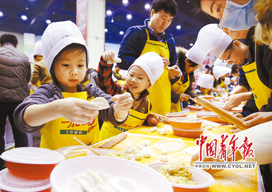 12月20日,河南郑州国际会展中心,小朋友们和父母一起包饺子。在冬至来临前的周末,6000多位家长和孩子一起包饺子,创下“最多人包饺子”的吉尼斯世界纪录。