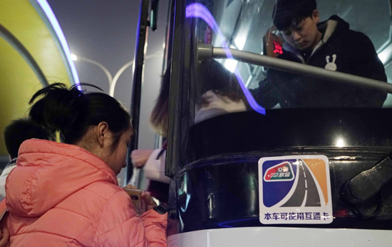 12月20日,乘客在北京北苑公交站乘坐贴有“交通联合”标识的公交车。