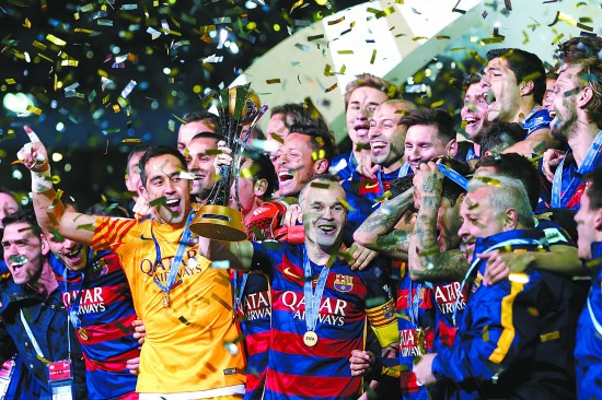 12月20日,日本横滨,巴塞罗那队队员在2015年世俱杯颁奖仪式上欢庆夺冠。