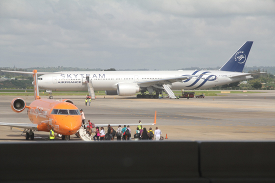 12月20日,在肯尼亚蒙巴萨莫伊国际机场拍摄的紧急迫降后的法航客机(后)。肯尼亚安全部门20日说,法国航空公司一架航班在发现机上有疑似爆炸物后,当天凌晨紧急降落在蒙巴萨,肯尼亚警方随后从客机上移除了疑似爆炸装置。