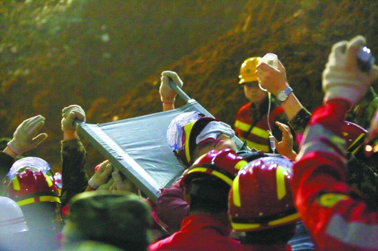 终于,贺勇将田泽明向上托举起来,洞口外的救援人员配合着他,一起将这个年轻的幸存者抬出洞中。