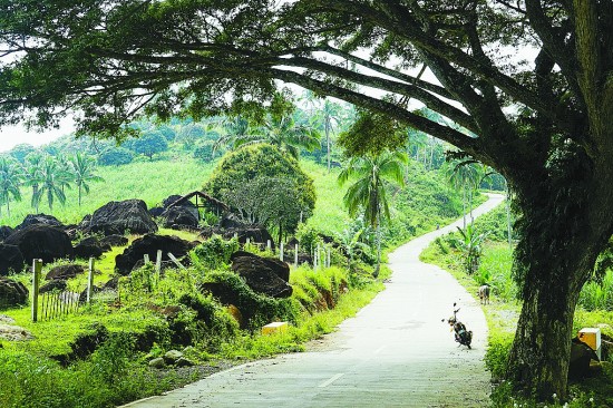 在观景台上四望,哪边都弥望的绿色“泥丸”,真是让人又惊奇,又纳闷:怎么可能有1000多座山长得像孪生兄弟呢?小山包之间的小块平地似乎都有人耕种,成熟的稻子还没收割,一片片泛着金色,田边、山脚下通常都会有几棵亭亭玉立的椰树,也遥遥地看得到几幢农舍,难免和诗人同怀:“桃花源里可耕田?”