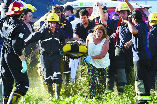 当地时间1月2日,2016年达喀尔拉力赛在11公里排位赛中,中国女车手郭美玲驾驶MINI赛车冲出赛道,导致多人严重受伤。图为工作人员在抢救受伤观众。CFP供图