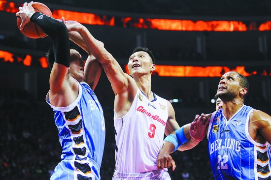1月3日,在CBA一场焦点战中,广东宏远队以117∶87击败北京首钢队。图为易建联(中)在比赛中拼抢。