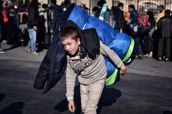 2月22日,在希腊比雷埃夫斯港,一名难民少年背着睡袋经过滞留的难民人群。希腊政府22日称,希腊正设法说服邻国马其顿允许阿富汗难民入境,以解决希腊边境及港口数千难民滞留的问题。新华社/法新