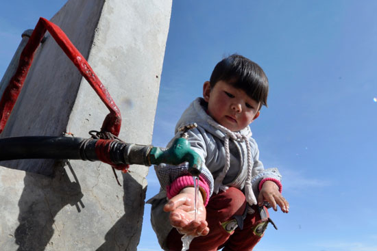 2月22日,一名藏族小朋友在甘肃省甘南藏族自治州夏河县桑科乡冬季牧场居住点的自来水取水处洗手。