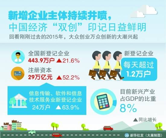 数据显示,2015年,全国新增的市场主体是1479.8万户,增长14.5%,其中企业433.9万户,比上年增长21.6%。新增主体注册资本28.99亿元,增长52%,企业户均是652万元。在北京中关村,平均每天诞生的企业达到了222家,去年全国日均新增企业1.2万家,2014年是1万家,改革之前是6900家。