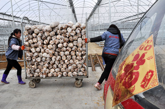 2月18日,在贵州威宁一家生物科技创业公司里,女工人在搬运利用生物废料生产的菌棒。该公司自2015年3月投产以来,采取“就近招工,就近就业”的方式,鼓励在沿海城市打工的女工们返乡就业,此举吸引了200余名女工返回家乡实现就业。视觉中国供图