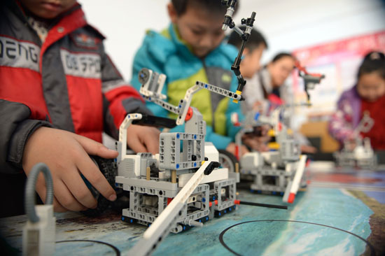 2月17日,河北邢台青少年科技馆,孩子们利用机器人编程操作自己制作的资源再生机器人。