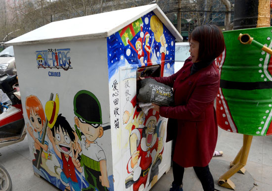 3月22日,一位市民将衣物投放到“爱心小屋”里。河南省郑州市一家大型商场门前的广场上摆放了10多个“爱心小屋”,市民可将旧衣物和玩具放在这里,让有需要的人们免费领取。