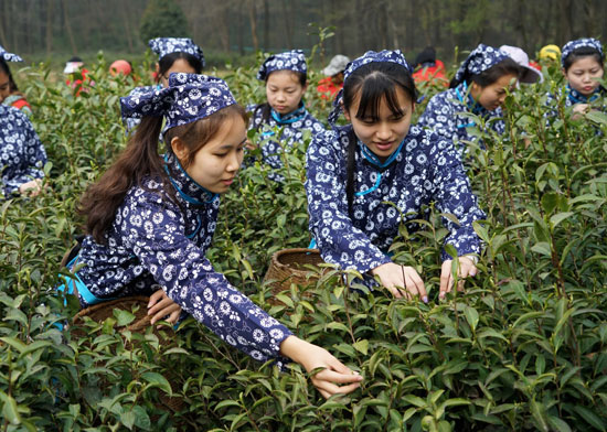 3月22日,来自南京农业大学茶学本科班的几名女生在茶园里采摘春茶。当日,南京中山陵茶厂举行钟山雨花茶的春茶开采仪式。南京雨花茶是中国十大名茶之一,芽叶精采、炒制工艺复杂,其制作工艺被列为江苏省非物质文化遗产。