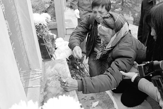 3月26日,云南屏边烈士陵园,王发坤烈士(电影《高山下的花环》主角梁三喜原型)遗孀李金花(中)在丈夫墓碑前,手握杜鹃花泣不成声。当天,由华夏保险-华夏慈善基金资助的英雄祭奠活动在屏边烈士陵园举行。