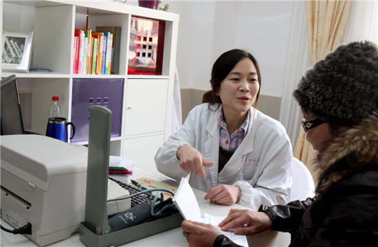 上海徐汇区斜土街道社区卫生服务中心的医生朱兰(左)与居民交流(资料照片)。朱兰与1060余户家庭签约,在全国家庭医生中第一个获得“中国医师奖”。