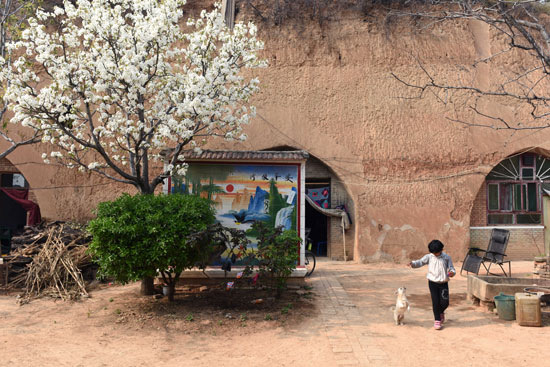 山西芮城,一个孩子正在开满梨花的土窑院落里玩耍。