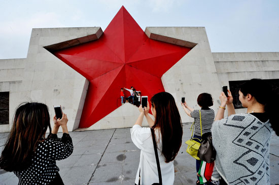 4月4日,江西省抚州市,游客在江西省广昌县红色雕塑群巨型五角星前拍照留影。红星高9米、宽10.3米,用钢材结构和大理石基座塑制而成,红星两侧还配有老一辈革命家等大型红色革命人物塑像,供游客瞻仰和接受红色革命教育。江西省广昌县是当年红军第五次反(围剿)的主战场。视觉中国供图