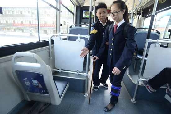 4月5日,山东省济南市,当天,济南公交一分公司三队、六分公司六队的驾驶员们轮流戴着花镜,拄着拐棍,背上和双腿各负重10公斤,双脚套上40cm长的束缚带,体验老年人在乘车过程中的诸多不便,从而在今后的驾驶过程中照顾老年乘客乘车。影子/视觉中国