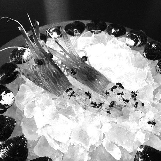 第一道菜是趴在碎冰上的海螯虾,尾壳被剥开,裸肉上爬着黑色大蚂蚁。利兹鼓起勇气尝了一口,觉得“口感疯狂”,而被咬的大虾身体挺起,“仿佛要和我击掌一样”。她战战兢兢地问雷德泽皮,虾是不是活的?“你感觉它是活的,其实已经死了。我在虾头插入一根针,刚死的三四分钟里它仍然会动。”
