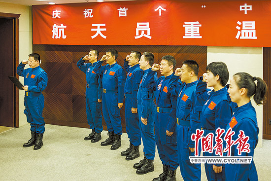 “举起我们的右手!”当天,随着中国进入太空的第一人、中国载人航天工程办公室副主任杨利伟的一声口令,9位航天员重温了加入中国人民解放军航天员大队的誓言——