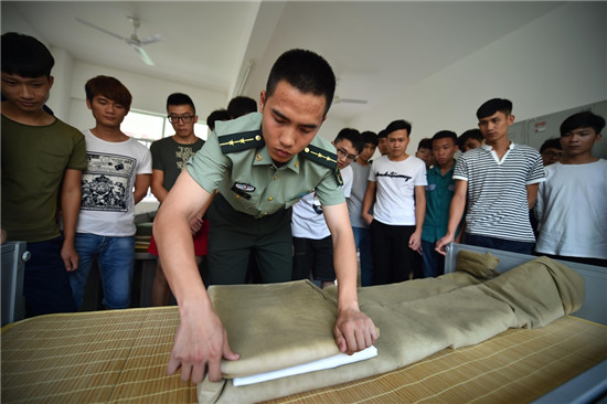 5月21日,大学生们在观看一名军官整理内务。
