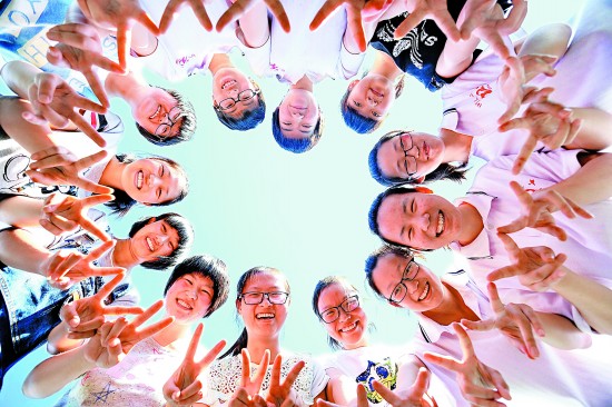 5月24日,河北省衡水市第二中学高三学生在操场摆出胜利手势。2016年高考临近,不少中学通过开展多种形式的集体“减压”活动,缓解高三考生应考压力,帮助他们以自信乐观的心态迎接高考。