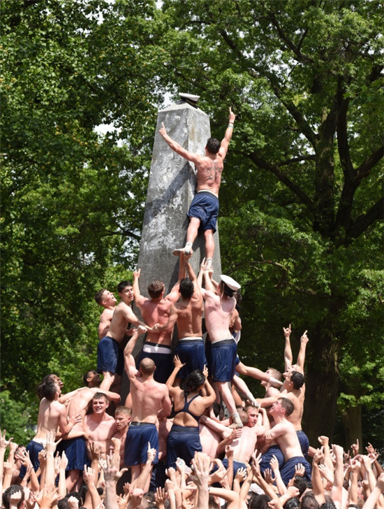 5月23日,在位于美国马里兰州首府安纳波利斯的美国海军学院,一年级学生攀爬赫恩登纪念碑。