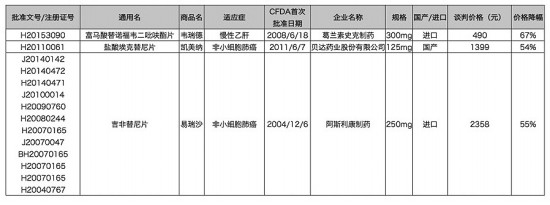 Insight数据库数据显示,替诺福韦酯片于2008年首次获国家食品药品监督管理总局(CFDA)批准,2014年在中国上市销售;吉非替尼片于2004年6月获CFDA批准进入中国;埃克替尼2011年获CFDA批准上市。