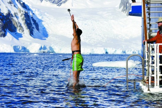 在南极跳水,预想过会很冷,但没想到会那么冷。脱掉衣服走出室外,心里一直给自己打气加油。一切准备就绪,拿着防水相机往下跳,入水那一刻头脑里已是一片空白。冒出水面时,我试图对着相机镜头说两句话,可是已经发不出声音了。游回岸上后,体温慢慢恢复,当船舱里的人为我鼓掌时,才感觉这其中的美好,自己又完成了永生不忘的一次挑战。
