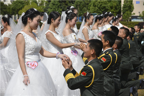 5月20日,火箭军某基地为百对新人举办了盛大的集体婚礼,新人们在战友和亲人的祝福声中走进婚姻殿堂。军人为国奉献,恋人为爱守候。据了解,百对新人中,既有今年1月1日以后结婚的同志,也有结婚多年却因执行任务一直未能举办婚礼的同志,还有同志带着宝宝来参加自己的婚礼。图为新郎集体向新娘求婚。