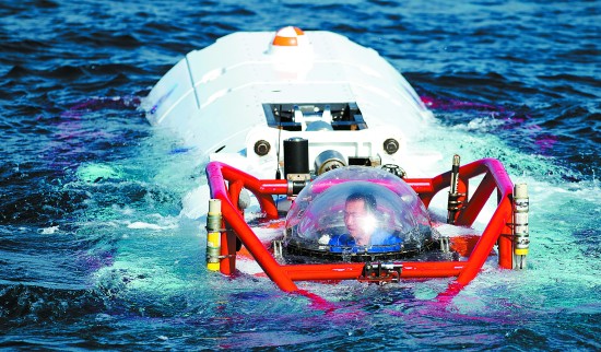 7月13日,在美国夏威夷,深潜救生艇操纵员朱昱晟操纵设备下潜。