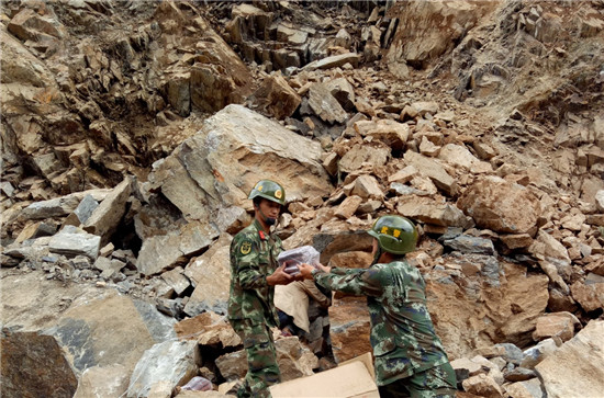 7月14日,武警交通二支队的爆破小组人员对巨石进行炸药填装。当日,受连续降雨影响,川藏公路西藏芒康县境内发生3处大面积山体塌方,导致道路中断,120余台车辆及280余名司乘人员被困。
