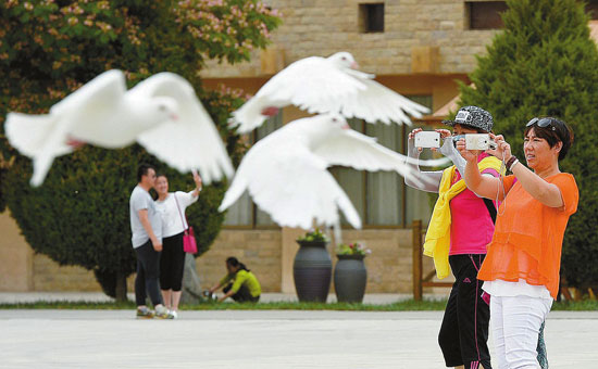 游客在宁夏中卫市沙坡头景区广场上拍摄飞翔的鸽子。宁夏是丝绸之路的重要节点,自然生态和历史人文资源得天独厚,被誉为“中国旅游的微缩盆景”。