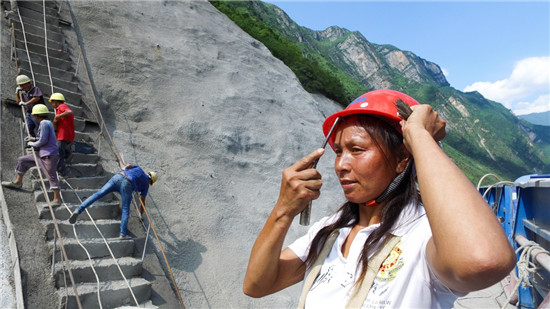 7月25日,“三峡蜘蛛人”王文莲在工作中。48岁的王文莲是“三峡蜘蛛人”中少有的女性成员,她干这项工作已有三年。