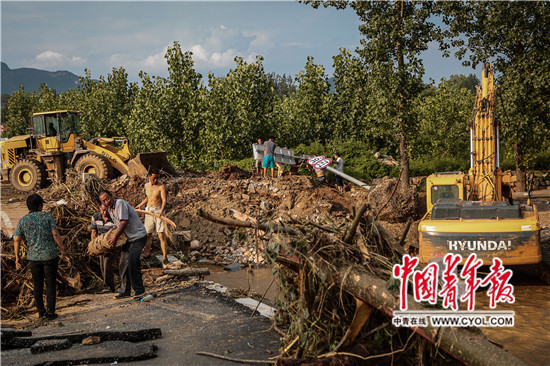 7月25日,河北省石家庄市灵寿县陈庄镇北庄村,工作人员在修复前一天夜里被冲断的北庄桥。24日灵寿县遭暴雨袭击,据了解,全县29个雨量站点,从24日18点至22点,历时5个小时,降雨量达100毫米以上有13个,其中有4个站点达到200毫米,最大值233.8毫米发生在青山背。