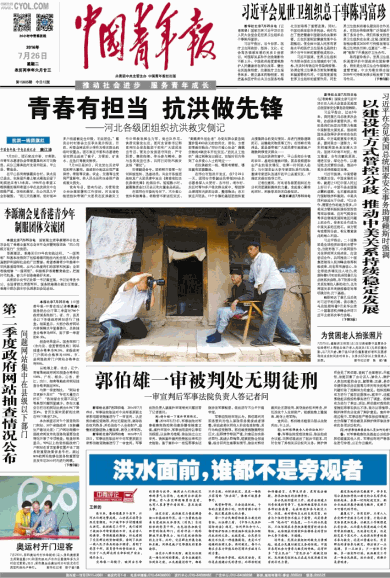 连日来,暴雨侵袭多个省市,江河水位超过警戒线,山洪泥石流等自然灾害频发,不少城市和乡村遭遇特大洪灾。抗洪救灾工作中,我们看到了被洪水冲垮家园的不幸、失去亲人的痛苦、等待救援的期盼,但也看到了灾区群众的坚韧顽强,看到了抗洪一线人民子弟兵的奋不顾身,看到了党员干部、团员青年的责任担当,他们为了人民群众的生命和财产安全,竭尽全力。