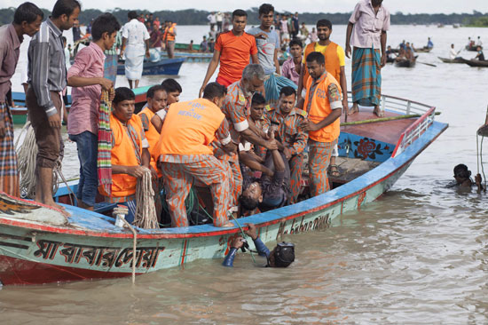 9月21日,在孟加拉国博里萨尔地区南部,搜救人员打捞上一具遇难者的遗体。孟加拉国警方21日说,当天在首都达卡以南169公里的博里萨尔地区的河道中发生沉船事故,造成12人死亡,多人失踪。 新华社/法新