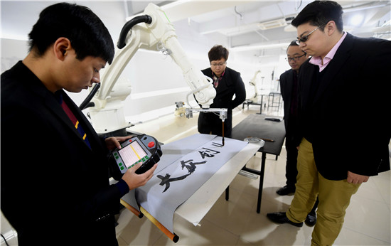 11月26日,“京津冀创客联盟”技术人员在展示经过他们改进后,性能更加优良的九轴机器人。