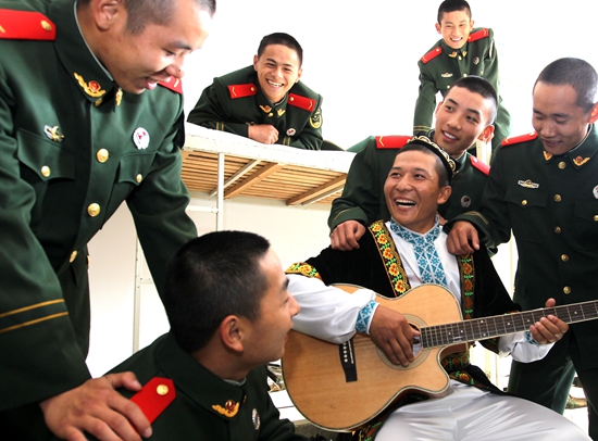 12月5日,艾麦尔·吾斯曼在训练之余为战友们弹琴演唱。武警上海总队四支队新兵连维吾尔族战士艾麦尔·吾斯曼来自新疆维吾尔自治区,今年从江南大学应征入伍。经过严格的新兵训练,艾麦尔·吾斯曼快速完成由大学生向合格军人的“漂亮转身”。新华社记者 陈飞/摄