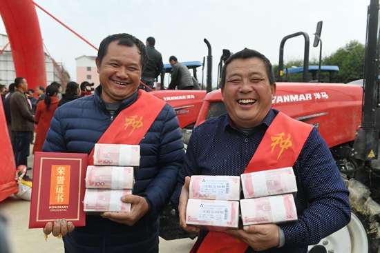 1月8日,“种植状元”万三毛(右)和刘高美一起合影。当日,江西安义县鼎湖乡种粮大户凌继河给手下的种粮农民发放308万元现金作为年终奖,这也是凌继河连续6年给农民发放年终奖。据介绍,凌继河把自己承包来的1.9万多亩田分块交给其他种粮能手管理,并确定一个基本产量,这些种粮能手平时每月预领5000元工资,到年底则根据全年总产领取奖金。新华社记者 周密/摄