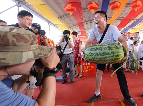 6月27日,观众和评出的“瓜王”合影。当日,开封杏花营镇第二届西瓜文化节“斗瓜”大赛在河南开封西瓜市场举行,当地百余名瓜农参赛,吸引众多游客前来参观。张涛/摄(新华社发)