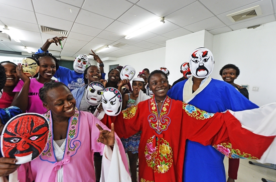 6月27日,肯尼亚大学生佩戴京剧脸谱合影。当日,来自肯尼亚内罗毕大学孔子学院的20名大学生来到天津师范大学,体验中国国粹京剧,感受传统中国文化魅力。史淞予/摄(新华社发)
